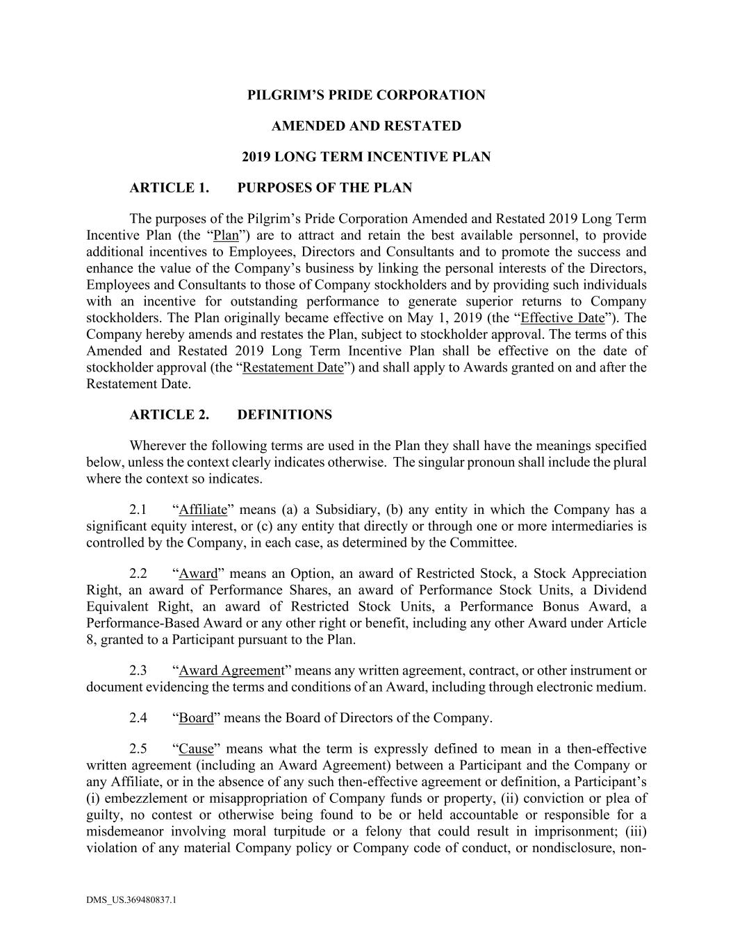 DMS_US.369480837.1 PILGRIM’S PRIDE CORPORATION AMENDED AND RESTATED 2019 LONG TERM INCENTIVE PLAN ARTICLE 1. PURPOSES OF THE PLAN The purposes of the Pilgrim’s Pride Corporation Amended and Restated 2019 Long Term Incentive Plan (the “Plan”) are to attract and retain the best available personnel, to provide additional incentives to Employees, Directors and Consultants and to promote the success and enhance the value of the Company’s business by linking the personal interests of the Directors, Employees and Consultants to those of Company stockholders and by providing such individuals with an incentive for outstanding performance to generate superior returns to Company stockholders. The Plan originally became effective on May 1, 2019 (the “Effective Date”). The Company hereby amends and restates the Plan, subject to stockholder approval. The terms of this Amended and Restated 2019 Long Term Incentive Plan shall be effective on the date of stockholder approval (the “Restatement Date”) and shall apply to Awards granted on and after the Restatement Date. ARTICLE 2. DEFINITIONS Wherever the following terms are used in the Plan they shall have the meanings specified below, unless the context clearly indicates otherwise. The singular pronoun shall include the plural where the context so indicates. 2.1 “Affiliate” means (a) a Subsidiary, (b) any entity in which the Company has a significant equity interest, or (c) any entity that directly or through one or more intermediaries is controlled by the Company, in each case, as determined by the Committee. 2.2 “Award” means an Option, an award of Restricted Stock, a Stock Appreciation Right, an award of Performance Shares, an award of Performance Stock Units, a Dividend Equivalent Right, an award of Restricted Stock Units, a Performance Bonus Award, a Performance-Based Award or any other right or benefit, including any other Award under Article 8, granted to a Participant pursuant to the Plan. 2.3 “Award Agreement” means any written agreement, contract, or other instrument or document evidencing the terms and conditions of an Award, including through electronic medium. 2.4 “Board” means the Board of Directors of the Company. 2.5 “Cause” means what the term is expressly defined to mean in a then-effective written agreement (including an Award Agreement) between a Participant and the Company or any Affiliate, or in the absence of any such then-effective agreement or definition, a Participant’s (i) embezzlement or misappropriation of Company funds or property, (ii) conviction or plea of guilty, no contest or otherwise being found to be or held accountable or responsible for a misdemeanor involving moral turpitude or a felony that could result in imprisonment; (iii) violation of any material Company policy or Company code of conduct, or nondisclosure, non-
