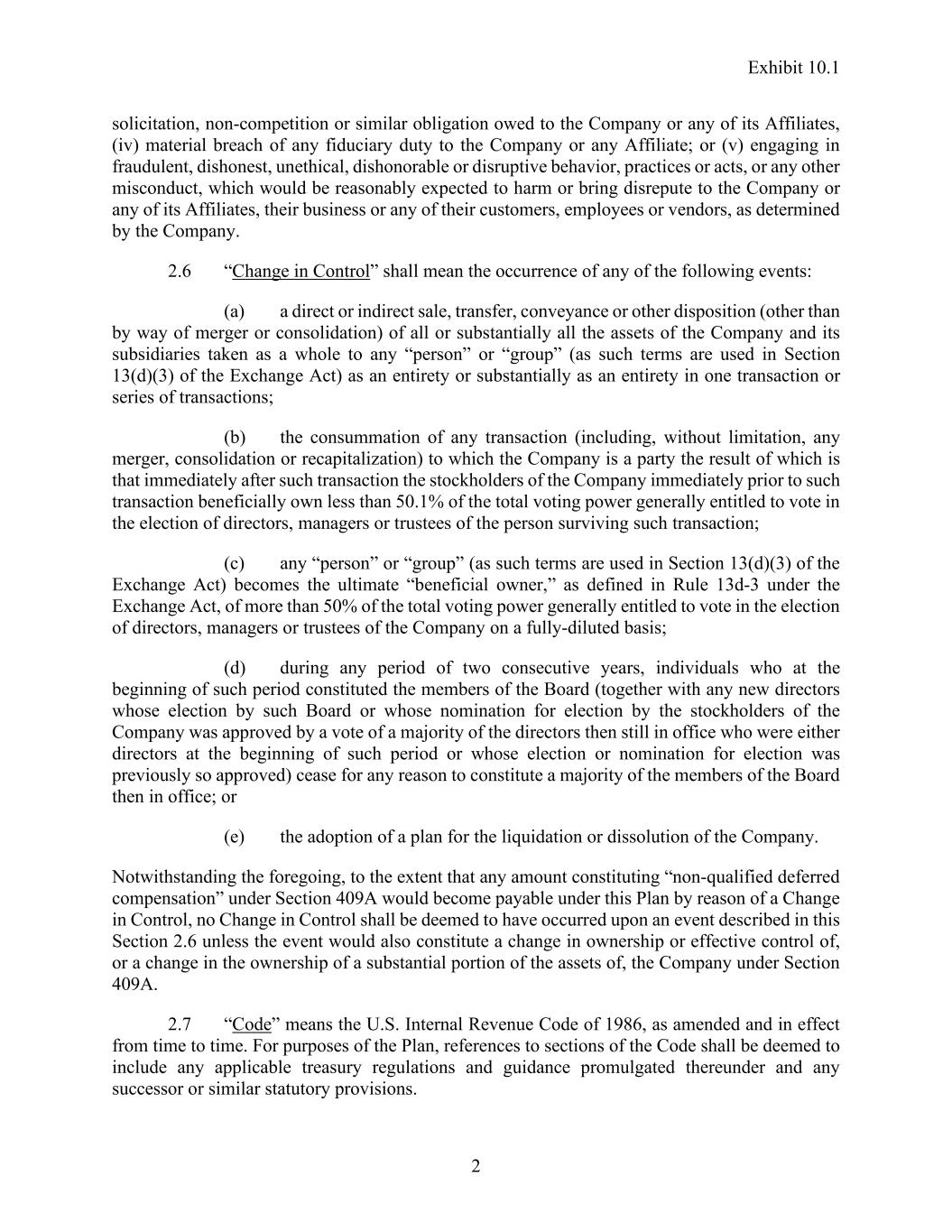 Exhibit 10.1 2 solicitation, non-competition or similar obligation owed to the Company or any of its Affiliates, (iv) material breach of any fiduciary duty to the Company or any Affiliate; or (v) engaging in fraudulent, dishonest, unethical, dishonorable or disruptive behavior, practices or acts, or any other misconduct, which would be reasonably expected to harm or bring disrepute to the Company or any of its Affiliates, their business or any of their customers, employees or vendors, as determined by the Company. 2.6 “Change in Control” shall mean the occurrence of any of the following events: (a) a direct or indirect sale, transfer, conveyance or other disposition (other than by way of merger or consolidation) of all or substantially all the assets of the Company and its subsidiaries taken as a whole to any “person” or “group” (as such terms are used in Section 13(d)(3) of the Exchange Act) as an entirety or substantially as an entirety in one transaction or series of transactions; (b) the consummation of any transaction (including, without limitation, any merger, consolidation or recapitalization) to which the Company is a party the result of which is that immediately after such transaction the stockholders of the Company immediately prior to such transaction beneficially own less than 50.1% of the total voting power generally entitled to vote in the election of directors, managers or trustees of the person surviving such transaction; (c) any “person” or “group” (as such terms are used in Section 13(d)(3) of the Exchange Act) becomes the ultimate “beneficial owner,” as defined in Rule 13d-3 under the Exchange Act, of more than 50% of the total voting power generally entitled to vote in the election of directors, managers or trustees of the Company on a fully-diluted basis; (d) during any period of two consecutive years, individuals who at the beginning of such period constituted the members of the Board (together with any new directors whose election by such Board or whose nomination for election by the stockholders of the Company was approved by a vote of a majority of the directors then still in office who were either directors at the beginning of such period or whose election or nomination for election was previously so approved) cease for any reason to constitute a majority of the members of the Board then in office; or (e) the adoption of a plan for the liquidation or dissolution of the Company. Notwithstanding the foregoing, to the extent that any amount constituting “non-qualified deferred compensation” under Section 409A would become payable under this Plan by reason of a Change in Control, no Change in Control shall be deemed to have occurred upon an event described in this Section 2.6 unless the event would also constitute a change in ownership or effective control of, or a change in the ownership of a substantial portion of the assets of, the Company under Section 409A. 2.7 “Code” means the U.S. Internal Revenue Code of 1986, as amended and in effect from time to time. For purposes of the Plan, references to sections of the Code shall be deemed to include any applicable treasury regulations and guidance promulgated thereunder and any successor or similar statutory provisions.