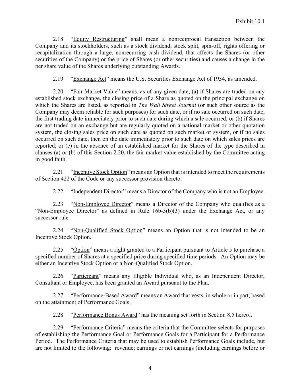 Exhibit 10.1 4 2.18 “Equity Restructuring” shall mean a nonreciprocal transaction between the Company and its stockholders, such as a stock dividend, stock split, spin-off, rights offering or recapitalization through a large, nonrecurring cash dividend, that affects the Shares (or other securities of the Company) or the price of Shares (or other securities) and causes a change in the per share value of the Shares underlying outstanding Awards. 2.19 “Exchange Act” means the U.S. Securities Exchange Act of 1934, as amended. 2.20 “Fair Market Value” means, as of any given date, (a) if Shares are traded on any established stock exchange, the closing price of a Share as quoted on the principal exchange on which the Shares are listed, as reported in The Wall Street Journal (or such other source as the Company may deem reliable for such purposes) for such date, or if no sale occurred on such date, the first trading date immediately prior to such date during which a sale occurred; or (b) if Shares are not traded on an exchange but are regularly quoted on a national market or other quotation system, the closing sales price on such date as quoted on such market or system, or if no sales occurred on such date, then on the date immediately prior to such date on which sales prices are reported; or (c) in the absence of an established market for the Shares of the type described in clauses (a) or (b) of this Section 2.20, the fair market value established by the Committee acting in good faith. 2.21 “Incentive Stock Option” means an Option that is intended to meet the requirements of Section 422 of the Code or any successor provision thereto. 2.22 “Independent Director” means a Director of the Company who is not an Employee. 2.23 “Non-Employee Director” means a Director of the Company who qualifies as a “Non-Employee Director” as defined in Rule 16b-3(b)(3) under the Exchange Act, or any successor rule. 2.24 “Non-Qualified Stock Option” means an Option that is not intended to be an Incentive Stock Option. 2.25 “Option” means a right granted to a Participant pursuant to Article 5 to purchase a specified number of Shares at a specified price during specified time periods. An Option may be either an Incentive Stock Option or a Non-Qualified Stock Option. 2.26 “Participant” means any Eligible Individual who, as an Independent Director, Consultant or Employee, has been granted an Award pursuant to the Plan. 2.27 “Performance-Based Award” means an Award that vests, in whole or in part, based on the attainment of Performance Goals. 2.28 “Performance Bonus Award” has the meaning set forth in Section 8.5 hereof. 2.29 “Performance Criteria” means the criteria that the Committee selects for purposes of establishing the Performance Goal or Performance Goals for a Participant for a Performance Period. The Performance Criteria that may be used to establish Performance Goals include, but are not limited to the following: revenue; earnings or net earnings (including earnings before or