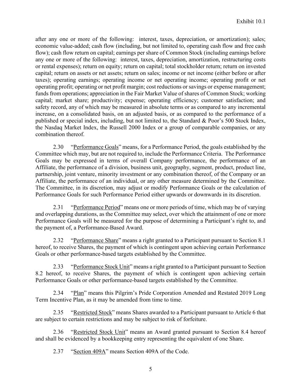 Exhibit 10.1 5 after any one or more of the following: interest, taxes, depreciation, or amortization); sales; economic value-added; cash flow (including, but not limited to, operating cash flow and free cash flow); cash flow return on capital; earnings per share of Common Stock (including earnings before any one or more of the following: interest, taxes, depreciation, amortization, restructuring costs or rental expenses); return on equity; return on capital; total stockholder return; return on invested capital; return on assets or net assets; return on sales; income or net income (either before or after taxes); operating earnings; operating income or net operating income; operating profit or net operating profit; operating or net profit margin; cost reductions or savings or expense management; funds from operations; appreciation in the Fair Market Value of shares of Common Stock; working capital; market share; productivity; expense; operating efficiency; customer satisfaction; and safety record, any of which may be measured in absolute terms or as compared to any incremental increase, on a consolidated basis, on an adjusted basis, or as compared to the performance of a published or special index, including, but not limited to, the Standard & Poor’s 500 Stock Index, the Nasdaq Market Index, the Russell 2000 Index or a group of comparable companies, or any combination thereof. 2.30 “Performance Goals” means, for a Performance Period, the goals established by the Committee which may, but are not required to, include the Performance Criteria. The Performance Goals may be expressed in terms of overall Company performance, the performance of an Affiliate, the performance of a division, business unit, geography, segment, product, product line, partnership, joint venture, minority investment or any combination thereof, of the Company or an Affiliate, the performance of an individual, or any other measure determined by the Committee. The Committee, in its discretion, may adjust or modify Performance Goals or the calculation of Performance Goals for such Performance Period either upwards or downwards in its discretion. 2.31 “Performance Period” means one or more periods of time, which may be of varying and overlapping durations, as the Committee may select, over which the attainment of one or more Performance Goals will be measured for the purpose of determining a Participant’s right to, and the payment of, a Performance-Based Award. 2.32 “Performance Share” means a right granted to a Participant pursuant to Section 8.1 hereof, to receive Shares, the payment of which is contingent upon achieving certain Performance Goals or other performance-based targets established by the Committee. 2.33 “Performance Stock Unit” means a right granted to a Participant pursuant to Section 8.2 hereof, to receive Shares, the payment of which is contingent upon achieving certain Performance Goals or other performance-based targets established by the Committee. 2.34 “Plan” means this Pilgrim’s Pride Corporation Amended and Restated 2019 Long Term Incentive Plan, as it may be amended from time to time. 2.35 “Restricted Stock” means Shares awarded to a Participant pursuant to Article 6 that are subject to certain restrictions and may be subject to risk of forfeiture. 2.36 “Restricted Stock Unit” means an Award granted pursuant to Section 8.4 hereof and shall be evidenced by a bookkeeping entry representing the equivalent of one Share. 2.37 “Section 409A” means Section 409A of the Code.