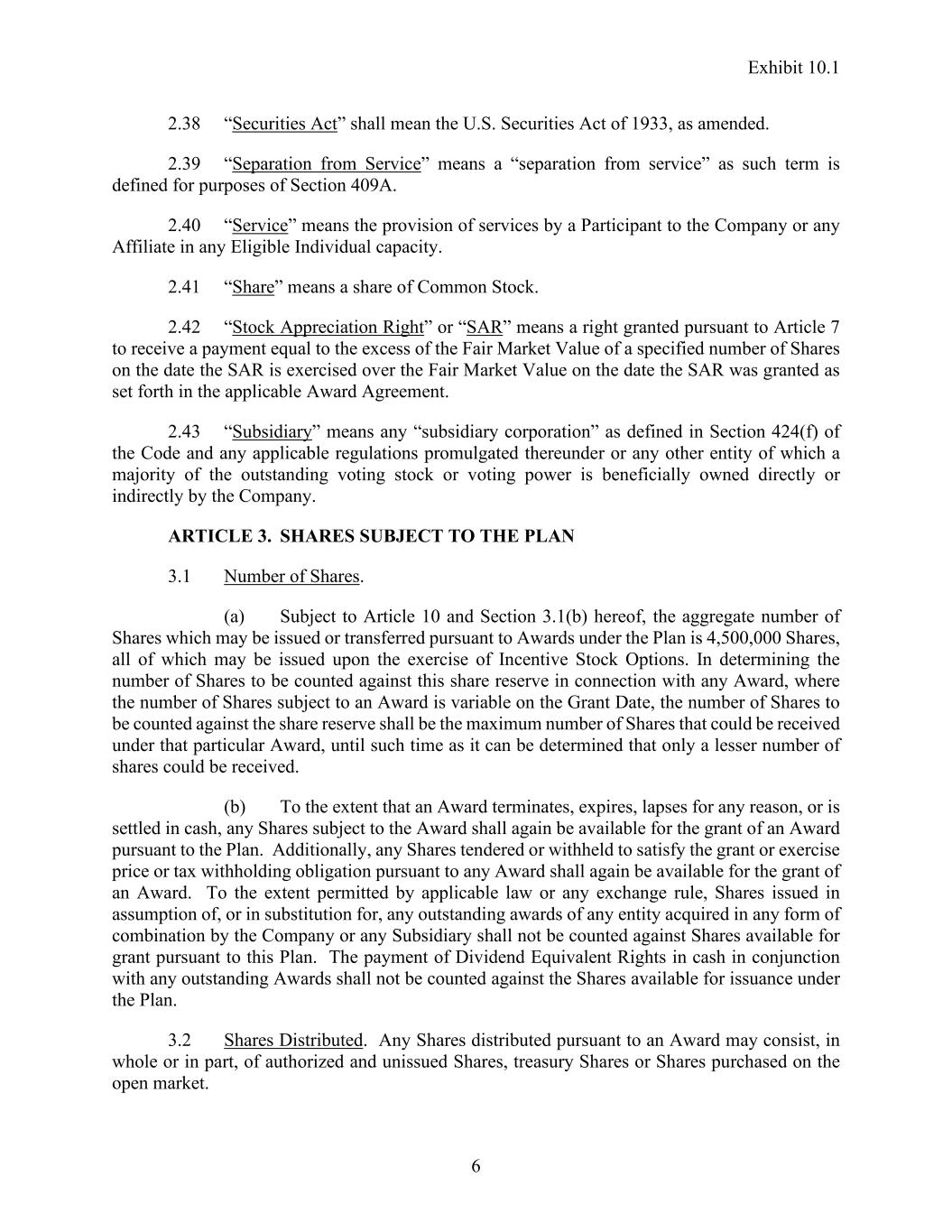 Exhibit 10.1 6 2.38 “Securities Act” shall mean the U.S. Securities Act of 1933, as amended. 2.39 “Separation from Service” means a “separation from service” as such term is defined for purposes of Section 409A. 2.40 “Service” means the provision of services by a Participant to the Company or any Affiliate in any Eligible Individual capacity. 2.41 “Share” means a share of Common Stock. 2.42 “Stock Appreciation Right” or “SAR” means a right granted pursuant to Article 7 to receive a payment equal to the excess of the Fair Market Value of a specified number of Shares on the date the SAR is exercised over the Fair Market Value on the date the SAR was granted as set forth in the applicable Award Agreement. 2.43 “Subsidiary” means any “subsidiary corporation” as defined in Section 424(f) of the Code and any applicable regulations promulgated thereunder or any other entity of which a majority of the outstanding voting stock or voting power is beneficially owned directly or indirectly by the Company. ARTICLE 3. SHARES SUBJECT TO THE PLAN 3.1 Number of Shares. (a) Subject to Article 10 and Section 3.1(b) hereof, the aggregate number of Shares which may be issued or transferred pursuant to Awards under the Plan is 4,500,000 Shares, all of which may be issued upon the exercise of Incentive Stock Options. In determining the number of Shares to be counted against this share reserve in connection with any Award, where the number of Shares subject to an Award is variable on the Grant Date, the number of Shares to be counted against the share reserve shall be the maximum number of Shares that could be received under that particular Award, until such time as it can be determined that only a lesser number of shares could be received. (b) To the extent that an Award terminates, expires, lapses for any reason, or is settled in cash, any Shares subject to the Award shall again be available for the grant of an Award pursuant to the Plan. Additionally, any Shares tendered or withheld to satisfy the grant or exercise price or tax withholding obligation pursuant to any Award shall again be available for the grant of an Award. To the extent permitted by applicable law or any exchange rule, Shares issued in assumption of, or in substitution for, any outstanding awards of any entity acquired in any form of combination by the Company or any Subsidiary shall not be counted against Shares available for grant pursuant to this Plan. The payment of Dividend Equivalent Rights in cash in conjunction with any outstanding Awards shall not be counted against the Shares available for issuance under the Plan. 3.2 Shares Distributed. Any Shares distributed pursuant to an Award may consist, in whole or in part, of authorized and unissued Shares, treasury Shares or Shares purchased on the open market.