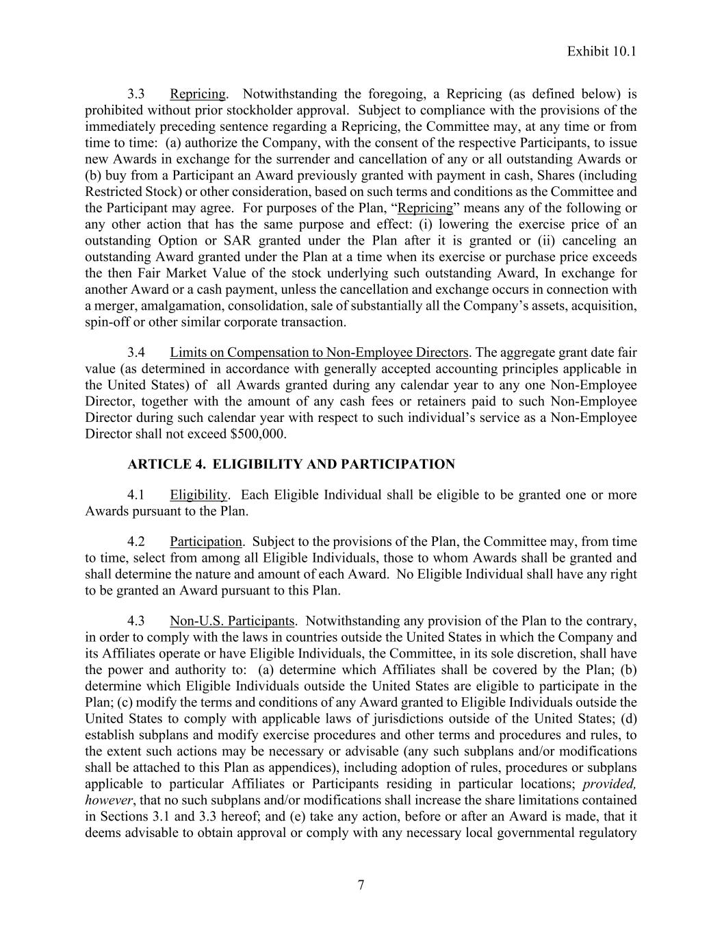 Exhibit 10.1 7 3.3 Repricing. Notwithstanding the foregoing, a Repricing (as defined below) is prohibited without prior stockholder approval. Subject to compliance with the provisions of the immediately preceding sentence regarding a Repricing, the Committee may, at any time or from time to time: (a) authorize the Company, with the consent of the respective Participants, to issue new Awards in exchange for the surrender and cancellation of any or all outstanding Awards or (b) buy from a Participant an Award previously granted with payment in cash, Shares (including Restricted Stock) or other consideration, based on such terms and conditions as the Committee and the Participant may agree. For purposes of the Plan, “Repricing” means any of the following or any other action that has the same purpose and effect: (i) lowering the exercise price of an outstanding Option or SAR granted under the Plan after it is granted or (ii) canceling an outstanding Award granted under the Plan at a time when its exercise or purchase price exceeds the then Fair Market Value of the stock underlying such outstanding Award, In exchange for another Award or a cash payment, unless the cancellation and exchange occurs in connection with a merger, amalgamation, consolidation, sale of substantially all the Company’s assets, acquisition, spin-off or other similar corporate transaction. 3.4 Limits on Compensation to Non-Employee Directors. The aggregate grant date fair value (as determined in accordance with generally accepted accounting principles applicable in the United States) of all Awards granted during any calendar year to any one Non-Employee Director, together with the amount of any cash fees or retainers paid to such Non-Employee Director during such calendar year with respect to such individual’s service as a Non-Employee Director shall not exceed $500,000. ARTICLE 4. ELIGIBILITY AND PARTICIPATION 4.1 Eligibility. Each Eligible Individual shall be eligible to be granted one or more Awards pursuant to the Plan. 4.2 Participation. Subject to the provisions of the Plan, the Committee may, from time to time, select from among all Eligible Individuals, those to whom Awards shall be granted and shall determine the nature and amount of each Award. No Eligible Individual shall have any right to be granted an Award pursuant to this Plan. 4.3 Non-U.S. Participants. Notwithstanding any provision of the Plan to the contrary, in order to comply with the laws in countries outside the United States in which the Company and its Affiliates operate or have Eligible Individuals, the Committee, in its sole discretion, shall have the power and authority to: (a) determine which Affiliates shall be covered by the Plan; (b) determine which Eligible Individuals outside the United States are eligible to participate in the Plan; (c) modify the terms and conditions of any Award granted to Eligible Individuals outside the United States to comply with applicable laws of jurisdictions outside of the United States; (d) establish subplans and modify exercise procedures and other terms and procedures and rules, to the extent such actions may be necessary or advisable (any such subplans and/or modifications shall be attached to this Plan as appendices), including adoption of rules, procedures or subplans applicable to particular Affiliates or Participants residing in particular locations; provided, however, that no such subplans and/or modifications shall increase the share limitations contained in Sections 3.1 and 3.3 hereof; and (e) take any action, before or after an Award is made, that it deems advisable to obtain approval or comply with any necessary local governmental regulatory