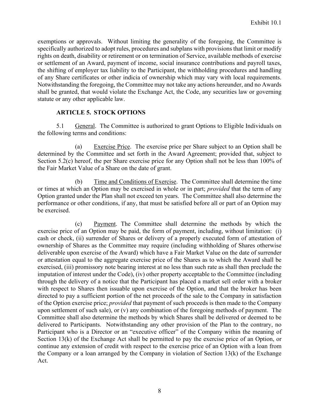 Exhibit 10.1 8 exemptions or approvals. Without limiting the generality of the foregoing, the Committee is specifically authorized to adopt rules, procedures and subplans with provisions that limit or modify rights on death, disability or retirement or on termination of Service, available methods of exercise or settlement of an Award, payment of income, social insurance contributions and payroll taxes, the shifting of employer tax liability to the Participant, the withholding procedures and handling of any Share certificates or other indicia of ownership which may vary with local requirements. Notwithstanding the foregoing, the Committee may not take any actions hereunder, and no Awards shall be granted, that would violate the Exchange Act, the Code, any securities law or governing statute or any other applicable law. ARTICLE 5. STOCK OPTIONS 5.1 General. The Committee is authorized to grant Options to Eligible Individuals on the following terms and conditions: (a) Exercise Price. The exercise price per Share subject to an Option shall be determined by the Committee and set forth in the Award Agreement; provided that, subject to Section 5.2(c) hereof, the per Share exercise price for any Option shall not be less than 100% of the Fair Market Value of a Share on the date of grant. (b) Time and Conditions of Exercise. The Committee shall determine the time or times at which an Option may be exercised in whole or in part; provided that the term of any Option granted under the Plan shall not exceed ten years. The Committee shall also determine the performance or other conditions, if any, that must be satisfied before all or part of an Option may be exercised. (c) Payment. The Committee shall determine the methods by which the exercise price of an Option may be paid, the form of payment, including, without limitation: (i) cash or check, (ii) surrender of Shares or delivery of a properly executed form of attestation of ownership of Shares as the Committee may require (including withholding of Shares otherwise deliverable upon exercise of the Award) which have a Fair Market Value on the date of surrender or attestation equal to the aggregate exercise price of the Shares as to which the Award shall be exercised, (iii) promissory note bearing interest at no less than such rate as shall then preclude the imputation of interest under the Code), (iv) other property acceptable to the Committee (including through the delivery of a notice that the Participant has placed a market sell order with a broker with respect to Shares then issuable upon exercise of the Option, and that the broker has been directed to pay a sufficient portion of the net proceeds of the sale to the Company in satisfaction of the Option exercise price; provided that payment of such proceeds is then made to the Company upon settlement of such sale), or (v) any combination of the foregoing methods of payment. The Committee shall also determine the methods by which Shares shall be delivered or deemed to be delivered to Participants. Notwithstanding any other provision of the Plan to the contrary, no Participant who is a Director or an “executive officer” of the Company within the meaning of Section 13(k) of the Exchange Act shall be permitted to pay the exercise price of an Option, or continue any extension of credit with respect to the exercise price of an Option with a loan from the Company or a loan arranged by the Company in violation of Section 13(k) of the Exchange Act.