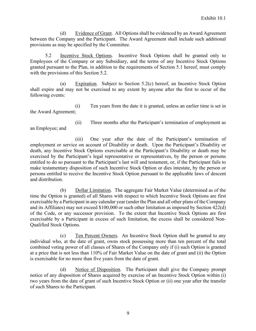 Exhibit 10.1 9 (d) Evidence of Grant. All Options shall be evidenced by an Award Agreement between the Company and the Participant. The Award Agreement shall include such additional provisions as may be specified by the Committee. 5.2 Incentive Stock Options. Incentive Stock Options shall be granted only to Employees of the Company or any Subsidiary, and the terms of any Incentive Stock Options granted pursuant to the Plan, in addition to the requirements of Section 5.1 hereof, must comply with the provisions of this Section 5.2. (a) Expiration. Subject to Section 5.2(c) hereof, an Incentive Stock Option shall expire and may not be exercised to any extent by anyone after the first to occur of the following events: (i) Ten years from the date it is granted, unless an earlier time is set in the Award Agreement; (ii) Three months after the Participant’s termination of employment as an Employee; and (iii) One year after the date of the Participant’s termination of employment or service on account of Disability or death. Upon the Participant’s Disability or death, any Incentive Stock Options exercisable at the Participant’s Disability or death may be exercised by the Participant’s legal representative or representatives, by the person or persons entitled to do so pursuant to the Participant’s last will and testament, or, if the Participant fails to make testamentary disposition of such Incentive Stock Option or dies intestate, by the person or persons entitled to receive the Incentive Stock Option pursuant to the applicable laws of descent and distribution. (b) Dollar Limitation. The aggregate Fair Market Value (determined as of the time the Option is granted) of all Shares with respect to which Incentive Stock Options are first exercisable by a Participant in any calendar year (under the Plan and all other plans of the Company and its Affiliates) may not exceed $100,000 or such other limitation as imposed by Section 422(d) of the Code, or any successor provision. To the extent that Incentive Stock Options are first exercisable by a Participant in excess of such limitation, the excess shall be considered Non- Qualified Stock Options. (c) Ten Percent Owners. An Incentive Stock Option shall be granted to any individual who, at the date of grant, owns stock possessing more than ten percent of the total combined voting power of all classes of Shares of the Company only if (i) such Option is granted at a price that is not less than 110% of Fair Market Value on the date of grant and (ii) the Option is exercisable for no more than five years from the date of grant. (d) Notice of Disposition. The Participant shall give the Company prompt notice of any disposition of Shares acquired by exercise of an Incentive Stock Option within (i) two years from the date of grant of such Incentive Stock Option or (ii) one year after the transfer of such Shares to the Participant.