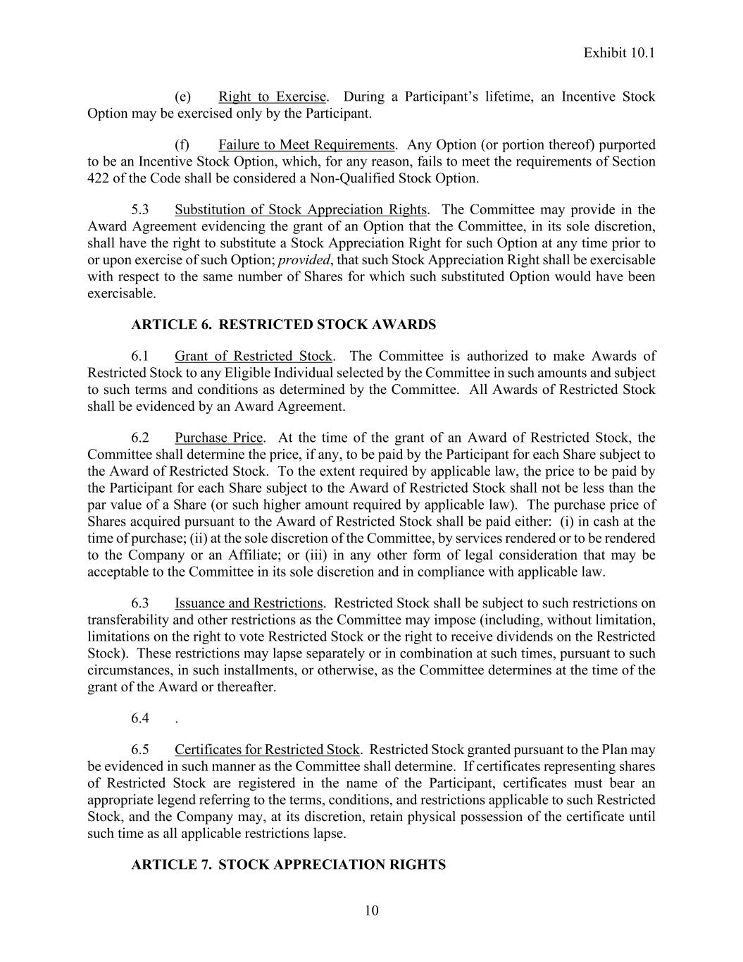Exhibit 10.1 10 (e) Right to Exercise. During a Participant’s lifetime, an Incentive Stock Option may be exercised only by the Participant. (f) Failure to Meet Requirements. Any Option (or portion thereof) purported to be an Incentive Stock Option, which, for any reason, fails to meet the requirements of Section 422 of the Code shall be considered a Non-Qualified Stock Option. 5.3 Substitution of Stock Appreciation Rights. The Committee may provide in the Award Agreement evidencing the grant of an Option that the Committee, in its sole discretion, shall have the right to substitute a Stock Appreciation Right for such Option at any time prior to or upon exercise of such Option; provided, that such Stock Appreciation Right shall be exercisable with respect to the same number of Shares for which such substituted Option would have been exercisable. ARTICLE 6. RESTRICTED STOCK AWARDS 6.1 Grant of Restricted Stock. The Committee is authorized to make Awards of Restricted Stock to any Eligible Individual selected by the Committee in such amounts and subject to such terms and conditions as determined by the Committee. All Awards of Restricted Stock shall be evidenced by an Award Agreement. 6.2 Purchase Price. At the time of the grant of an Award of Restricted Stock, the Committee shall determine the price, if any, to be paid by the Participant for each Share subject to the Award of Restricted Stock. To the extent required by applicable law, the price to be paid by the Participant for each Share subject to the Award of Restricted Stock shall not be less than the par value of a Share (or such higher amount required by applicable law). The purchase price of Shares acquired pursuant to the Award of Restricted Stock shall be paid either: (i) in cash at the time of purchase; (ii) at the sole discretion of the Committee, by services rendered or to be rendered to the Company or an Affiliate; or (iii) in any other form of legal consideration that may be acceptable to the Committee in its sole discretion and in compliance with applicable law. 6.3 Issuance and Restrictions. Restricted Stock shall be subject to such restrictions on transferability and other restrictions as the Committee may impose (including, without limitation, limitations on the right to vote Restricted Stock or the right to receive dividends on the Restricted Stock). These restrictions may lapse separately or in combination at such times, pursuant to such circumstances, in such installments, or otherwise, as the Committee determines at the time of the grant of the Award or thereafter. 6.4 . 6.5 Certificates for Restricted Stock. Restricted Stock granted pursuant to the Plan may be evidenced in such manner as the Committee shall determine. If certificates representing shares of Restricted Stock are registered in the name of the Participant, certificates must bear an appropriate legend referring to the terms, conditions, and restrictions applicable to such Restricted Stock, and the Company may, at its discretion, retain physical possession of the certificate until such time as all applicable restrictions lapse. ARTICLE 7. STOCK APPRECIATION RIGHTS
