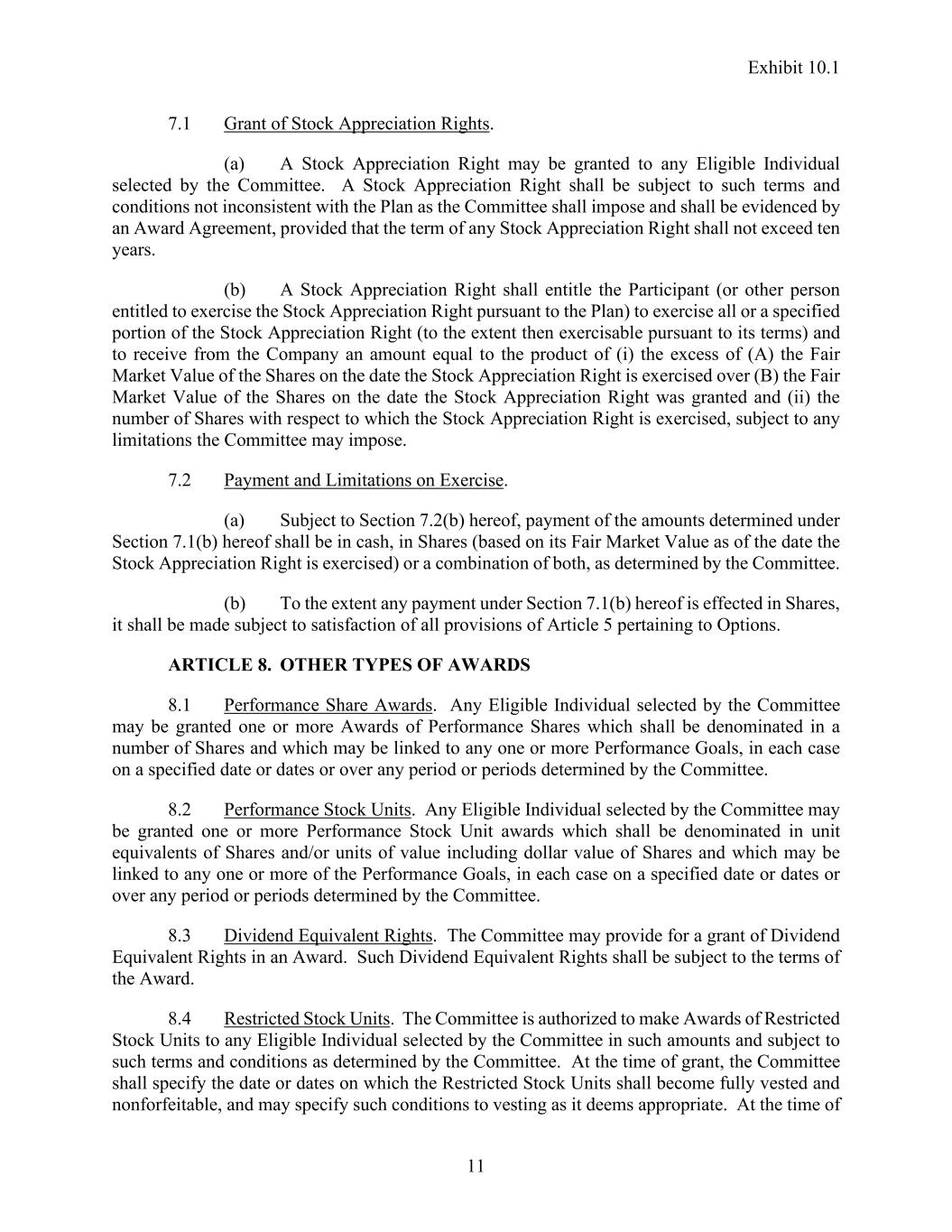 Exhibit 10.1 11 7.1 Grant of Stock Appreciation Rights. (a) A Stock Appreciation Right may be granted to any Eligible Individual selected by the Committee. A Stock Appreciation Right shall be subject to such terms and conditions not inconsistent with the Plan as the Committee shall impose and shall be evidenced by an Award Agreement, provided that the term of any Stock Appreciation Right shall not exceed ten years. (b) A Stock Appreciation Right shall entitle the Participant (or other person entitled to exercise the Stock Appreciation Right pursuant to the Plan) to exercise all or a specified portion of the Stock Appreciation Right (to the extent then exercisable pursuant to its terms) and to receive from the Company an amount equal to the product of (i) the excess of (A) the Fair Market Value of the Shares on the date the Stock Appreciation Right is exercised over (B) the Fair Market Value of the Shares on the date the Stock Appreciation Right was granted and (ii) the number of Shares with respect to which the Stock Appreciation Right is exercised, subject to any limitations the Committee may impose. 7.2 Payment and Limitations on Exercise. (a) Subject to Section 7.2(b) hereof, payment of the amounts determined under Section 7.1(b) hereof shall be in cash, in Shares (based on its Fair Market Value as of the date the Stock Appreciation Right is exercised) or a combination of both, as determined by the Committee. (b) To the extent any payment under Section 7.1(b) hereof is effected in Shares, it shall be made subject to satisfaction of all provisions of Article 5 pertaining to Options. ARTICLE 8. OTHER TYPES OF AWARDS 8.1 Performance Share Awards. Any Eligible Individual selected by the Committee may be granted one or more Awards of Performance Shares which shall be denominated in a number of Shares and which may be linked to any one or more Performance Goals, in each case on a specified date or dates or over any period or periods determined by the Committee. 8.2 Performance Stock Units. Any Eligible Individual selected by the Committee may be granted one or more Performance Stock Unit awards which shall be denominated in unit equivalents of Shares and/or units of value including dollar value of Shares and which may be linked to any one or more of the Performance Goals, in each case on a specified date or dates or over any period or periods determined by the Committee. 8.3 Dividend Equivalent Rights. The Committee may provide for a grant of Dividend Equivalent Rights in an Award. Such Dividend Equivalent Rights shall be subject to the terms of the Award. 8.4 Restricted Stock Units. The Committee is authorized to make Awards of Restricted Stock Units to any Eligible Individual selected by the Committee in such amounts and subject to such terms and conditions as determined by the Committee. At the time of grant, the Committee shall specify the date or dates on which the Restricted Stock Units shall become fully vested and nonforfeitable, and may specify such conditions to vesting as it deems appropriate. At the time of