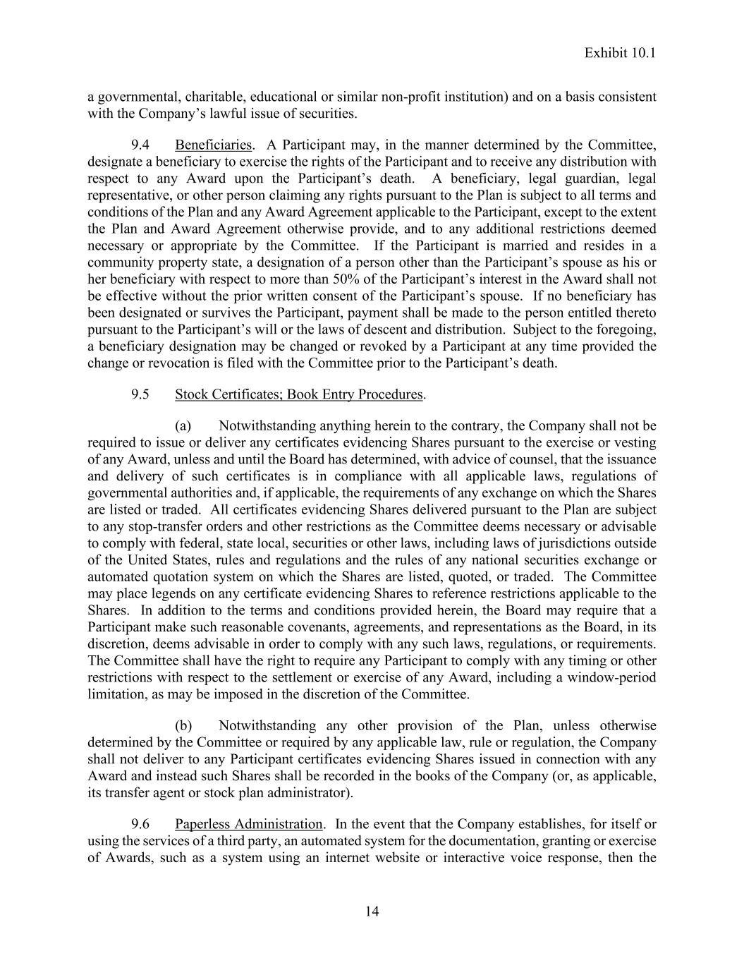 Exhibit 10.1 14 a governmental, charitable, educational or similar non-profit institution) and on a basis consistent with the Company’s lawful issue of securities. 9.4 Beneficiaries. A Participant may, in the manner determined by the Committee, designate a beneficiary to exercise the rights of the Participant and to receive any distribution with respect to any Award upon the Participant’s death. A beneficiary, legal guardian, legal representative, or other person claiming any rights pursuant to the Plan is subject to all terms and conditions of the Plan and any Award Agreement applicable to the Participant, except to the extent the Plan and Award Agreement otherwise provide, and to any additional restrictions deemed necessary or appropriate by the Committee. If the Participant is married and resides in a community property state, a designation of a person other than the Participant’s spouse as his or her beneficiary with respect to more than 50% of the Participant’s interest in the Award shall not be effective without the prior written consent of the Participant’s spouse. If no beneficiary has been designated or survives the Participant, payment shall be made to the person entitled thereto pursuant to the Participant’s will or the laws of descent and distribution. Subject to the foregoing, a beneficiary designation may be changed or revoked by a Participant at any time provided the change or revocation is filed with the Committee prior to the Participant’s death. 9.5 Stock Certificates; Book Entry Procedures. (a) Notwithstanding anything herein to the contrary, the Company shall not be required to issue or deliver any certificates evidencing Shares pursuant to the exercise or vesting of any Award, unless and until the Board has determined, with advice of counsel, that the issuance and delivery of such certificates is in compliance with all applicable laws, regulations of governmental authorities and, if applicable, the requirements of any exchange on which the Shares are listed or traded. All certificates evidencing Shares delivered pursuant to the Plan are subject to any stop-transfer orders and other restrictions as the Committee deems necessary or advisable to comply with federal, state local, securities or other laws, including laws of jurisdictions outside of the United States, rules and regulations and the rules of any national securities exchange or automated quotation system on which the Shares are listed, quoted, or traded. The Committee may place legends on any certificate evidencing Shares to reference restrictions applicable to the Shares. In addition to the terms and conditions provided herein, the Board may require that a Participant make such reasonable covenants, agreements, and representations as the Board, in its discretion, deems advisable in order to comply with any such laws, regulations, or requirements. The Committee shall have the right to require any Participant to comply with any timing or other restrictions with respect to the settlement or exercise of any Award, including a window-period limitation, as may be imposed in the discretion of the Committee. (b) Notwithstanding any other provision of the Plan, unless otherwise determined by the Committee or required by any applicable law, rule or regulation, the Company shall not deliver to any Participant certificates evidencing Shares issued in connection with any Award and instead such Shares shall be recorded in the books of the Company (or, as applicable, its transfer agent or stock plan administrator). 9.6 Paperless Administration. In the event that the Company establishes, for itself or using the services of a third party, an automated system for the documentation, granting or exercise of Awards, such as a system using an internet website or interactive voice response, then the