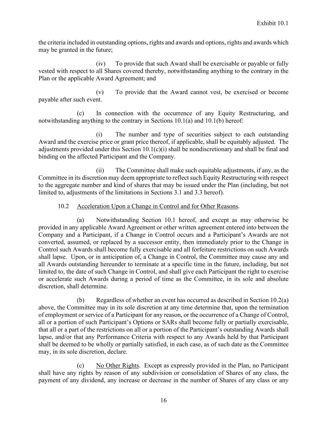 Exhibit 10.1 16 the criteria included in outstanding options, rights and awards and options, rights and awards which may be granted in the future; (iv) To provide that such Award shall be exercisable or payable or fully vested with respect to all Shares covered thereby, notwithstanding anything to the contrary in the Plan or the applicable Award Agreement; and (v) To provide that the Award cannot vest, be exercised or become payable after such event. (c) In connection with the occurrence of any Equity Restructuring, and notwithstanding anything to the contrary in Sections 10.1(a) and 10.1(b) hereof: (i) The number and type of securities subject to each outstanding Award and the exercise price or grant price thereof, if applicable, shall be equitably adjusted. The adjustments provided under this Section 10.1(c)(i) shall be nondiscretionary and shall be final and binding on the affected Participant and the Company. (ii) The Committee shall make such equitable adjustments, if any, as the Committee in its discretion may deem appropriate to reflect such Equity Restructuring with respect to the aggregate number and kind of shares that may be issued under the Plan (including, but not limited to, adjustments of the limitations in Sections 3.1 and 3.3 hereof). 10.2 Acceleration Upon a Change in Control and for Other Reasons. (a) Notwithstanding Section 10.1 hereof, and except as may otherwise be provided in any applicable Award Agreement or other written agreement entered into between the Company and a Participant, if a Change in Control occurs and a Participant’s Awards are not converted, assumed, or replaced by a successor entity, then immediately prior to the Change in Control such Awards shall become fully exercisable and all forfeiture restrictions on such Awards shall lapse. Upon, or in anticipation of, a Change in Control, the Committee may cause any and all Awards outstanding hereunder to terminate at a specific time in the future, including, but not limited to, the date of such Change in Control, and shall give each Participant the right to exercise or accelerate such Awards during a period of time as the Committee, in its sole and absolute discretion, shall determine. (b) Regardless of whether an event has occurred as described in Section 10.2(a) above, the Committee may in its sole discretion at any time determine that, upon the termination of employment or service of a Participant for any reason, or the occurrence of a Change of Control, all or a portion of such Participant’s Options or SARs shall become fully or partially exercisable, that all or a part of the restrictions on all or a portion of the Participant’s outstanding Awards shall lapse, and/or that any Performance Criteria with respect to any Awards held by that Participant shall be deemed to be wholly or partially satisfied, in each case, as of such date as the Committee may, in its sole discretion, declare. (c) No Other Rights. Except as expressly provided in the Plan, no Participant shall have any rights by reason of any subdivision or consolidation of Shares of any class, the payment of any dividend, any increase or decrease in the number of Shares of any class or any