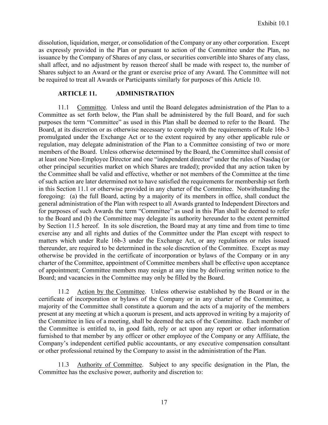 Exhibit 10.1 17 dissolution, liquidation, merger, or consolidation of the Company or any other corporation. Except as expressly provided in the Plan or pursuant to action of the Committee under the Plan, no issuance by the Company of Shares of any class, or securities convertible into Shares of any class, shall affect, and no adjustment by reason thereof shall be made with respect to, the number of Shares subject to an Award or the grant or exercise price of any Award. The Committee will not be required to treat all Awards or Participants similarly for purposes of this Article 10. ARTICLE 11. ADMINISTRATION 11.1 Committee. Unless and until the Board delegates administration of the Plan to a Committee as set forth below, the Plan shall be administered by the full Board, and for such purposes the term “Committee” as used in this Plan shall be deemed to refer to the Board. The Board, at its discretion or as otherwise necessary to comply with the requirements of Rule 16b-3 promulgated under the Exchange Act or to the extent required by any other applicable rule or regulation, may delegate administration of the Plan to a Committee consisting of two or more members of the Board. Unless otherwise determined by the Board, the Committee shall consist of at least one Non-Employee Director and one “independent director” under the rules of Nasdaq (or other principal securities market on which Shares are traded); provided that any action taken by the Committee shall be valid and effective, whether or not members of the Committee at the time of such action are later determined not to have satisfied the requirements for membership set forth in this Section 11.1 or otherwise provided in any charter of the Committee. Notwithstanding the foregoing: (a) the full Board, acting by a majority of its members in office, shall conduct the general administration of the Plan with respect to all Awards granted to Independent Directors and for purposes of such Awards the term “Committee” as used in this Plan shall be deemed to refer to the Board and (b) the Committee may delegate its authority hereunder to the extent permitted by Section 11.5 hereof. In its sole discretion, the Board may at any time and from time to time exercise any and all rights and duties of the Committee under the Plan except with respect to matters which under Rule 16b-3 under the Exchange Act, or any regulations or rules issued thereunder, are required to be determined in the sole discretion of the Committee. Except as may otherwise be provided in the certificate of incorporation or bylaws of the Company or in any charter of the Committee, appointment of Committee members shall be effective upon acceptance of appointment; Committee members may resign at any time by delivering written notice to the Board; and vacancies in the Committee may only be filled by the Board. 11.2 Action by the Committee. Unless otherwise established by the Board or in the certificate of incorporation or bylaws of the Company or in any charter of the Committee, a majority of the Committee shall constitute a quorum and the acts of a majority of the members present at any meeting at which a quorum is present, and acts approved in writing by a majority of the Committee in lieu of a meeting, shall be deemed the acts of the Committee. Each member of the Committee is entitled to, in good faith, rely or act upon any report or other information furnished to that member by any officer or other employee of the Company or any Affiliate, the Company’s independent certified public accountants, or any executive compensation consultant or other professional retained by the Company to assist in the administration of the Plan. 11.3 Authority of Committee. Subject to any specific designation in the Plan, the Committee has the exclusive power, authority and discretion to: