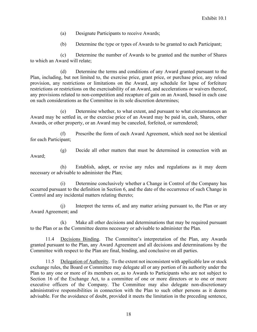 Exhibit 10.1 18 (a) Designate Participants to receive Awards; (b) Determine the type or types of Awards to be granted to each Participant; (c) Determine the number of Awards to be granted and the number of Shares to which an Award will relate; (d) Determine the terms and conditions of any Award granted pursuant to the Plan, including, but not limited to, the exercise price, grant price, or purchase price, any reload provision, any restrictions or limitations on the Award, any schedule for lapse of forfeiture restrictions or restrictions on the exercisability of an Award, and accelerations or waivers thereof, any provisions related to non-competition and recapture of gain on an Award, based in each case on such considerations as the Committee in its sole discretion determines; (e) Determine whether, to what extent, and pursuant to what circumstances an Award may be settled in, or the exercise price of an Award may be paid in, cash, Shares, other Awards, or other property, or an Award may be canceled, forfeited, or surrendered; (f) Prescribe the form of each Award Agreement, which need not be identical for each Participant; (g) Decide all other matters that must be determined in connection with an Award; (h) Establish, adopt, or revise any rules and regulations as it may deem necessary or advisable to administer the Plan; (i) Determine conclusively whether a Change in Control of the Company has occurred pursuant to the definition in Section 6, and the date of the occurrence of such Change in Control and any incidental matters relating thereto; (j) Interpret the terms of, and any matter arising pursuant to, the Plan or any Award Agreement; and (k) Make all other decisions and determinations that may be required pursuant to the Plan or as the Committee deems necessary or advisable to administer the Plan. 11.4 Decisions Binding. The Committee’s interpretation of the Plan, any Awards granted pursuant to the Plan, any Award Agreement and all decisions and determinations by the Committee with respect to the Plan are final, binding, and conclusive on all parties. 11.5 Delegation of Authority. To the extent not inconsistent with applicable law or stock exchange rules, the Board or Committee may delegate all or any portion of its authority under the Plan to any one or more of its members or, as to Awards to Participants who are not subject to Section 16 of the Exchange Act, to a committee of one or more directors or to one or more executive officers of the Company. The Committee may also delegate non-discretionary administrative responsibilities in connection with the Plan to such other persons as it deems advisable. For the avoidance of doubt, provided it meets the limitation in the preceding sentence,
