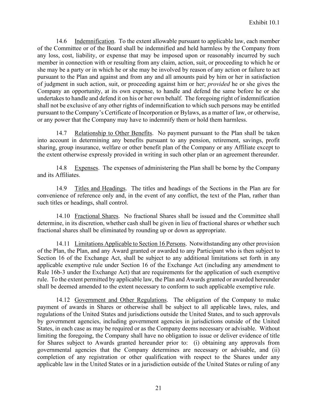 Exhibit 10.1 21 14.6 Indemnification. To the extent allowable pursuant to applicable law, each member of the Committee or of the Board shall be indemnified and held harmless by the Company from any loss, cost, liability, or expense that may be imposed upon or reasonably incurred by such member in connection with or resulting from any claim, action, suit, or proceeding to which he or she may be a party or in which he or she may be involved by reason of any action or failure to act pursuant to the Plan and against and from any and all amounts paid by him or her in satisfaction of judgment in such action, suit, or proceeding against him or her; provided he or she gives the Company an opportunity, at its own expense, to handle and defend the same before he or she undertakes to handle and defend it on his or her own behalf. The foregoing right of indemnification shall not be exclusive of any other rights of indemnification to which such persons may be entitled pursuant to the Company’s Certificate of Incorporation or Bylaws, as a matter of law, or otherwise, or any power that the Company may have to indemnify them or hold them harmless. 14.7 Relationship to Other Benefits. No payment pursuant to the Plan shall be taken into account in determining any benefits pursuant to any pension, retirement, savings, profit sharing, group insurance, welfare or other benefit plan of the Company or any Affiliate except to the extent otherwise expressly provided in writing in such other plan or an agreement thereunder. 14.8 Expenses. The expenses of administering the Plan shall be borne by the Company and its Affiliates. 14.9 Titles and Headings. The titles and headings of the Sections in the Plan are for convenience of reference only and, in the event of any conflict, the text of the Plan, rather than such titles or headings, shall control. 14.10 Fractional Shares. No fractional Shares shall be issued and the Committee shall determine, in its discretion, whether cash shall be given in lieu of fractional shares or whether such fractional shares shall be eliminated by rounding up or down as appropriate. 14.11 Limitations Applicable to Section 16 Persons. Notwithstanding any other provision of the Plan, the Plan, and any Award granted or awarded to any Participant who is then subject to Section 16 of the Exchange Act, shall be subject to any additional limitations set forth in any applicable exemptive rule under Section 16 of the Exchange Act (including any amendment to Rule 16b-3 under the Exchange Act) that are requirements for the application of such exemptive rule. To the extent permitted by applicable law, the Plan and Awards granted or awarded hereunder shall be deemed amended to the extent necessary to conform to such applicable exemptive rule. 14.12 Government and Other Regulations. The obligation of the Company to make payment of awards in Shares or otherwise shall be subject to all applicable laws, rules, and regulations of the United States and jurisdictions outside the United States, and to such approvals by government agencies, including government agencies in jurisdictions outside of the United States, in each case as may be required or as the Company deems necessary or advisable. Without limiting the foregoing, the Company shall have no obligation to issue or deliver evidence of title for Shares subject to Awards granted hereunder prior to: (i) obtaining any approvals from governmental agencies that the Company determines are necessary or advisable, and (ii) completion of any registration or other qualification with respect to the Shares under any applicable law in the United States or in a jurisdiction outside of the United States or ruling of any