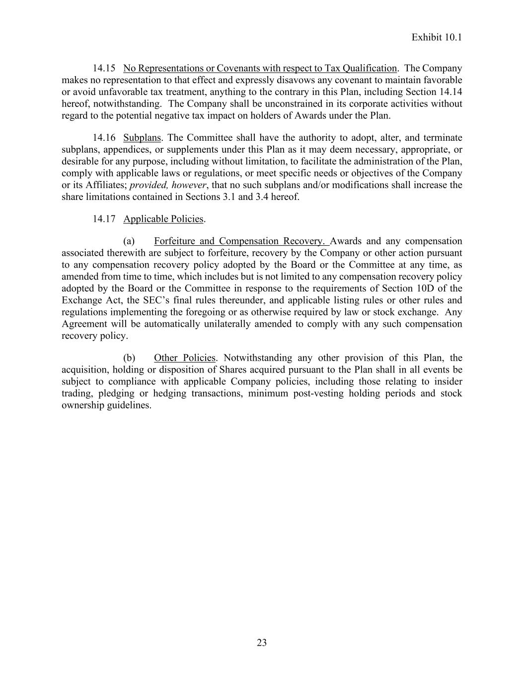 Exhibit 10.1 23 14.15 No Representations or Covenants with respect to Tax Qualification. The Company makes no representation to that effect and expressly disavows any covenant to maintain favorable or avoid unfavorable tax treatment, anything to the contrary in this Plan, including Section 14.14 hereof, notwithstanding. The Company shall be unconstrained in its corporate activities without regard to the potential negative tax impact on holders of Awards under the Plan. 14.16 Subplans. The Committee shall have the authority to adopt, alter, and terminate subplans, appendices, or supplements under this Plan as it may deem necessary, appropriate, or desirable for any purpose, including without limitation, to facilitate the administration of the Plan, comply with applicable laws or regulations, or meet specific needs or objectives of the Company or its Affiliates; provided, however, that no such subplans and/or modifications shall increase the share limitations contained in Sections 3.1 and 3.4 hereof. 14.17 Applicable Policies. (a) Forfeiture and Compensation Recovery. Awards and any compensation associated therewith are subject to forfeiture, recovery by the Company or other action pursuant to any compensation recovery policy adopted by the Board or the Committee at any time, as amended from time to time, which includes but is not limited to any compensation recovery policy adopted by the Board or the Committee in response to the requirements of Section 10D of the Exchange Act, the SEC’s final rules thereunder, and applicable listing rules or other rules and regulations implementing the foregoing or as otherwise required by law or stock exchange. Any Agreement will be automatically unilaterally amended to comply with any such compensation recovery policy. (b) Other Policies. Notwithstanding any other provision of this Plan, the acquisition, holding or disposition of Shares acquired pursuant to the Plan shall in all events be subject to compliance with applicable Company policies, including those relating to insider trading, pledging or hedging transactions, minimum post-vesting holding periods and stock ownership guidelines.